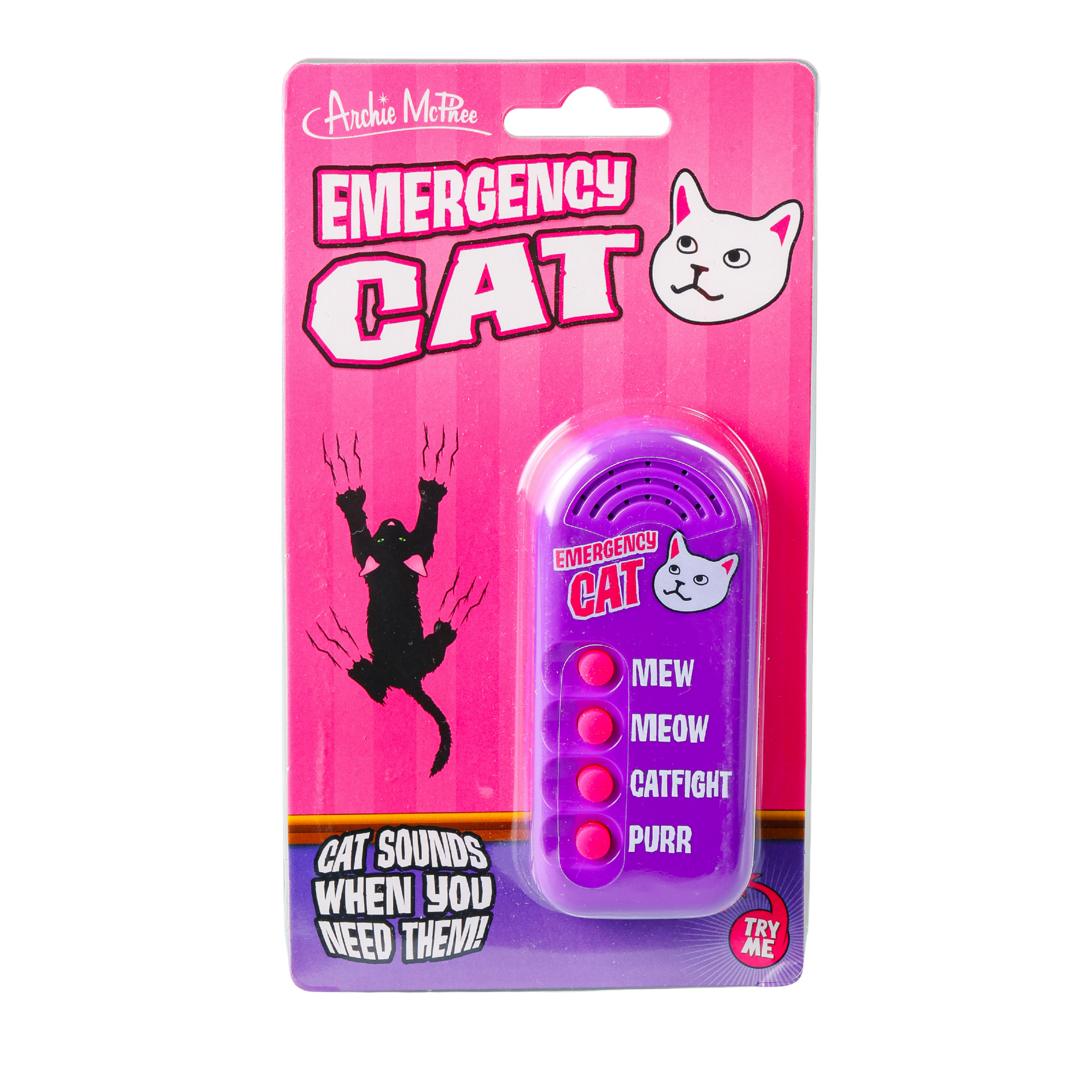 Four iconic feline sounds: mew, meow, purr, and full-on street brawl — all at your fingertips.